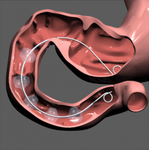 The device can be placed in the small intestine in about 15 minutes, taken out in five minutes, if necessary. It doesn’t require any suturing or hooks to hold it in place.