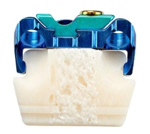 Zimmer’s Optio-C System is comprised of one Anterior Cervical Plate, three bone screws and either a PEEK IBFD or structural allograft/autograft (pictured). The modular stand-alone system offers secure fixation with “no profile”, being secured by an anti-migration system.
